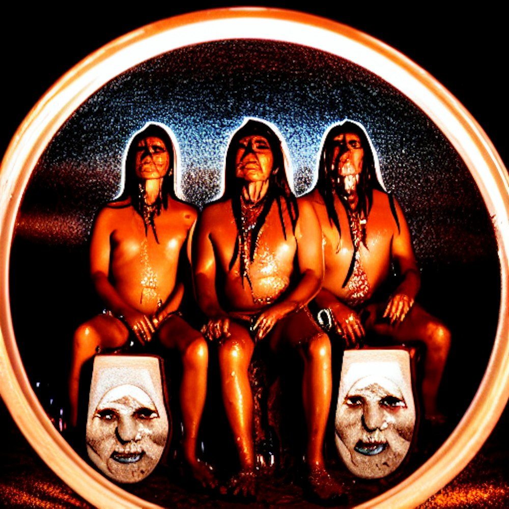 melting, dripping, shiny, plastic, spiraling, monolith, trippy, with native americans sitting around in a circle, 50mm portrait, cinematic lighting