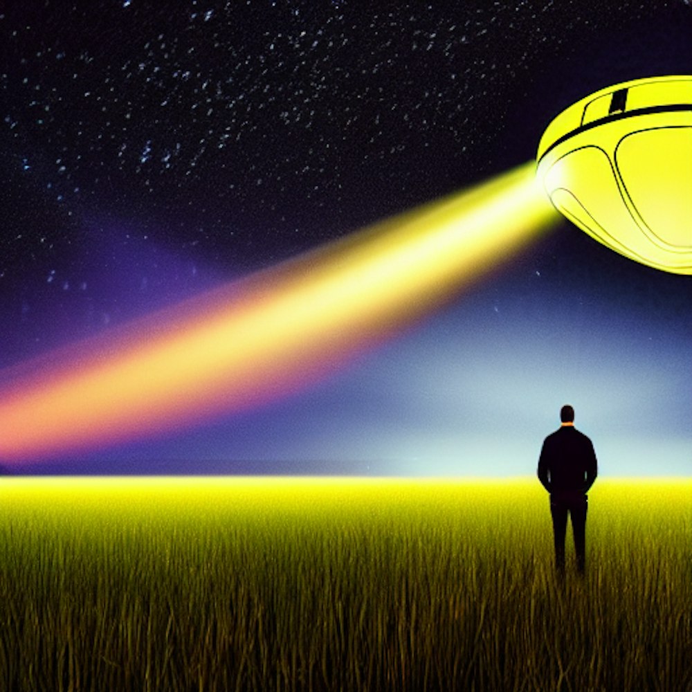 A man in a field, being abducted, by a hyper realistic UFO with loads of lights, at night