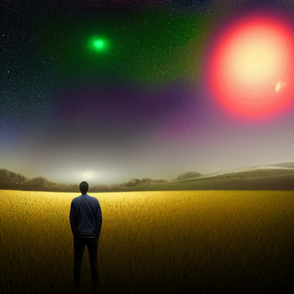 A man in a field, being abducted, by a hyper realistic UFO with loads of lights, at night