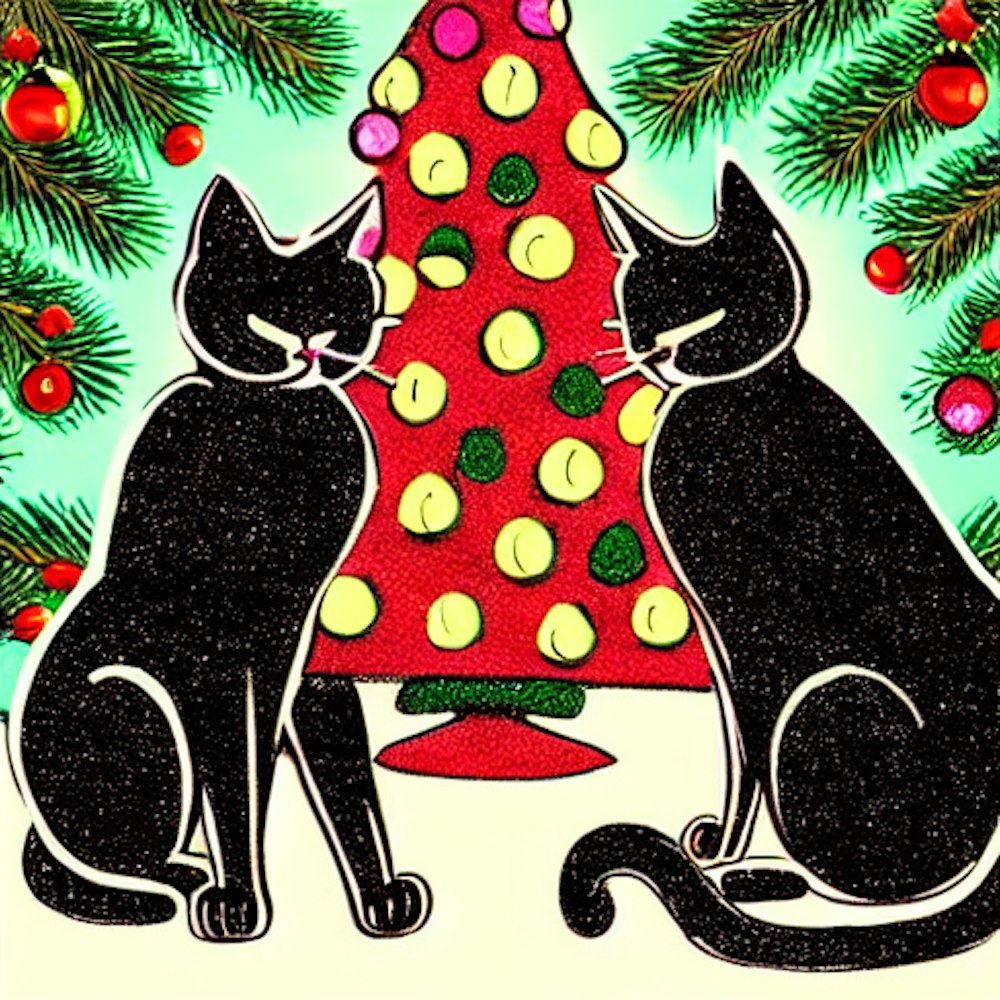 two cats in front of 60s christmas tree doodle