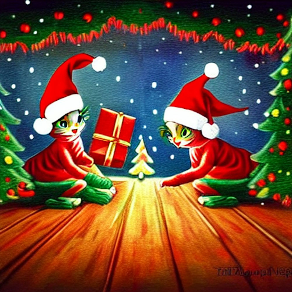 two mischievous little cat elves decking the halls lofi 60s Christmas tree ho ho ho painting
