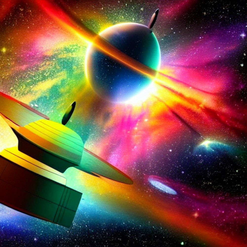 A sophisticated space ship travelling really quickly towards a colourful nebula