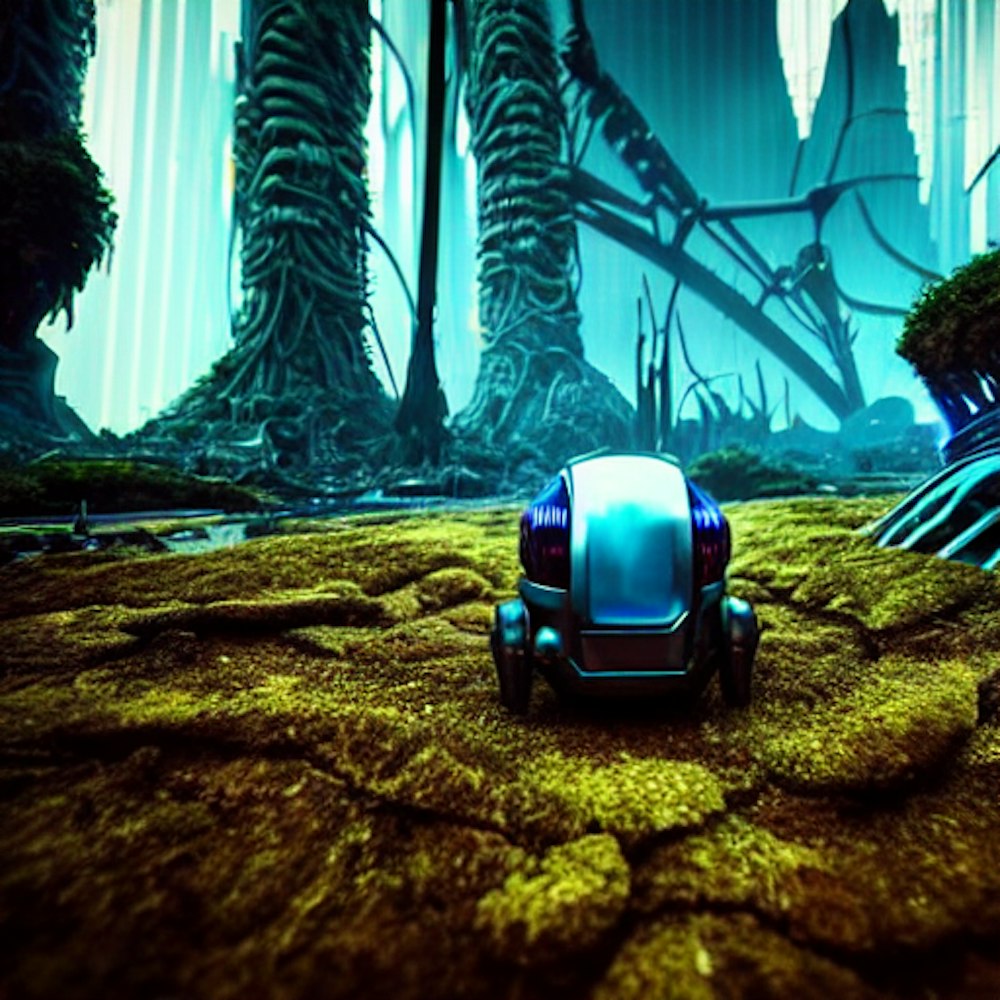 futuristic surroundings, darksynth, cyberpunk, submerged city, lost civilization, alien planet, extraterrestrial world, forest, cybercity backdrop, 8k, highquality, blue color, cyberpunk robot, bipedal vehicle, dead robots, rusty robot dog parts on ground