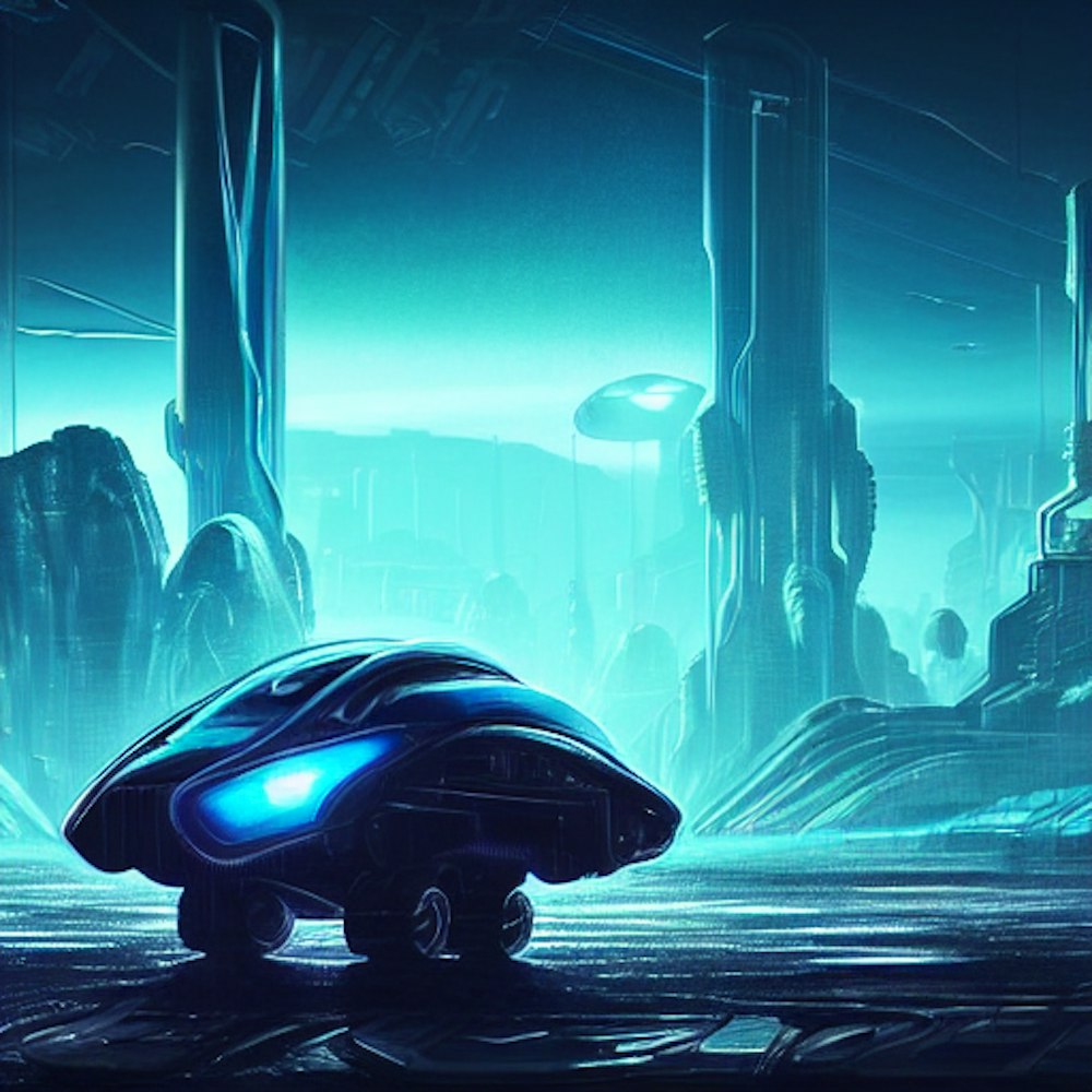futuristic surroundings, darksynth, cyberpunk, submerged city, lost civilization, alien planet, extraterrestrial world, island, cybercity backdrop, 8k, highquality, blue color, cyberpunk robot, bipedal vehicle, dead robots, rusty car parts on ground