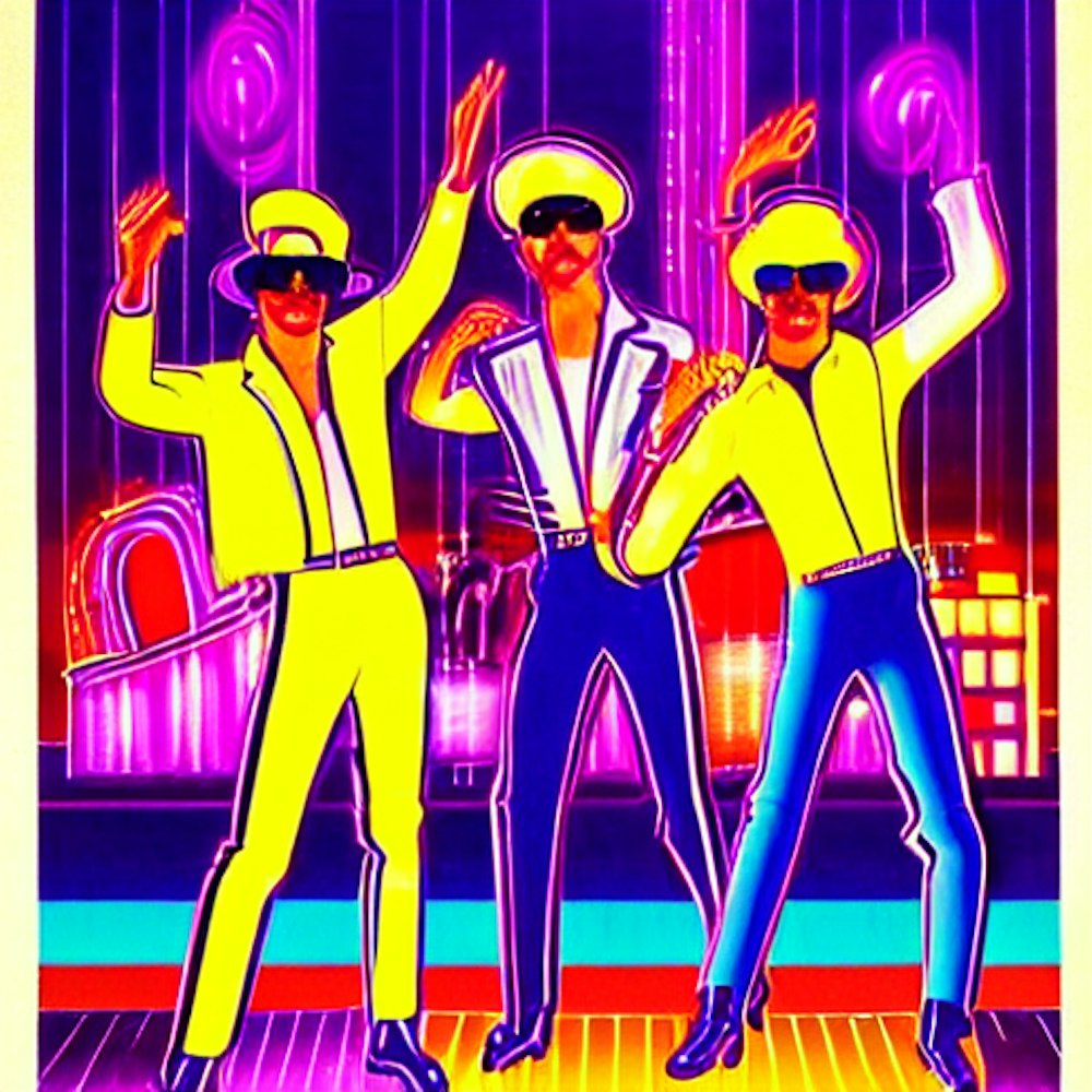 80s retro poster of three men with glistening hats and sunglasses dancing on a neon street