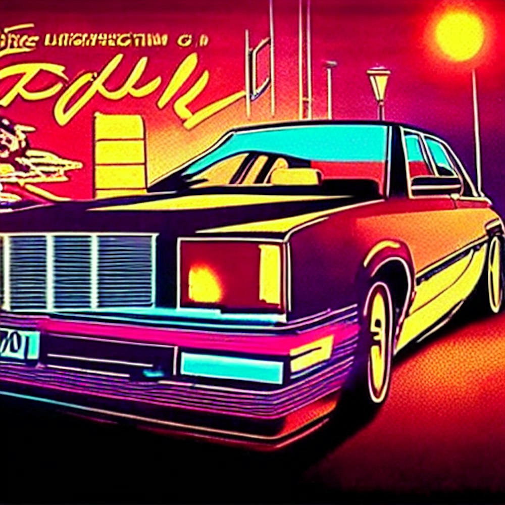 80s film poster of three men in an oldtimer on a road with neonlights