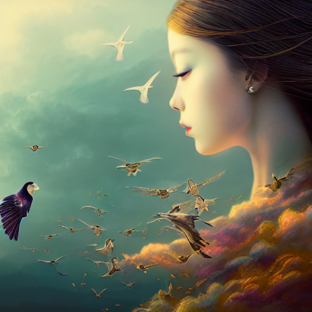 girl fly with birds, by  Pablo Amaringo, Miho Hirano,ornate, dynamic, particulate, rich colors, elegant, smooth, sharp focus, octane render, amazing depth panoramic, dreamlike, ethereal fantasy , 8k resolution concept, dynamic lighting intricately detailed triadic colors volumetric lighting