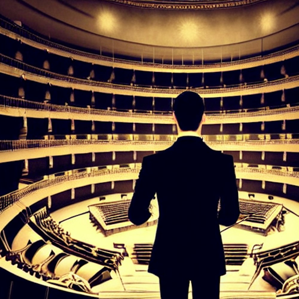 elegant man from behind with an orchestra in a classical amphitheater