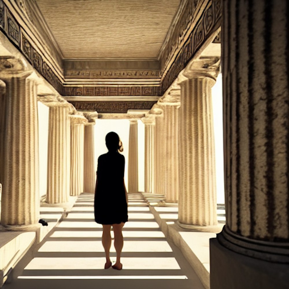 woman in the distance in the middle of a Greek palace without a roof
