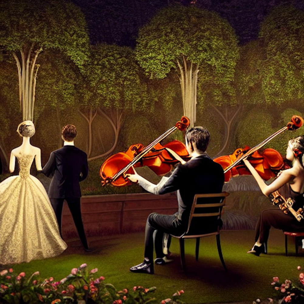elegant man and woman watching an orchestra in a garden in the middle of the night