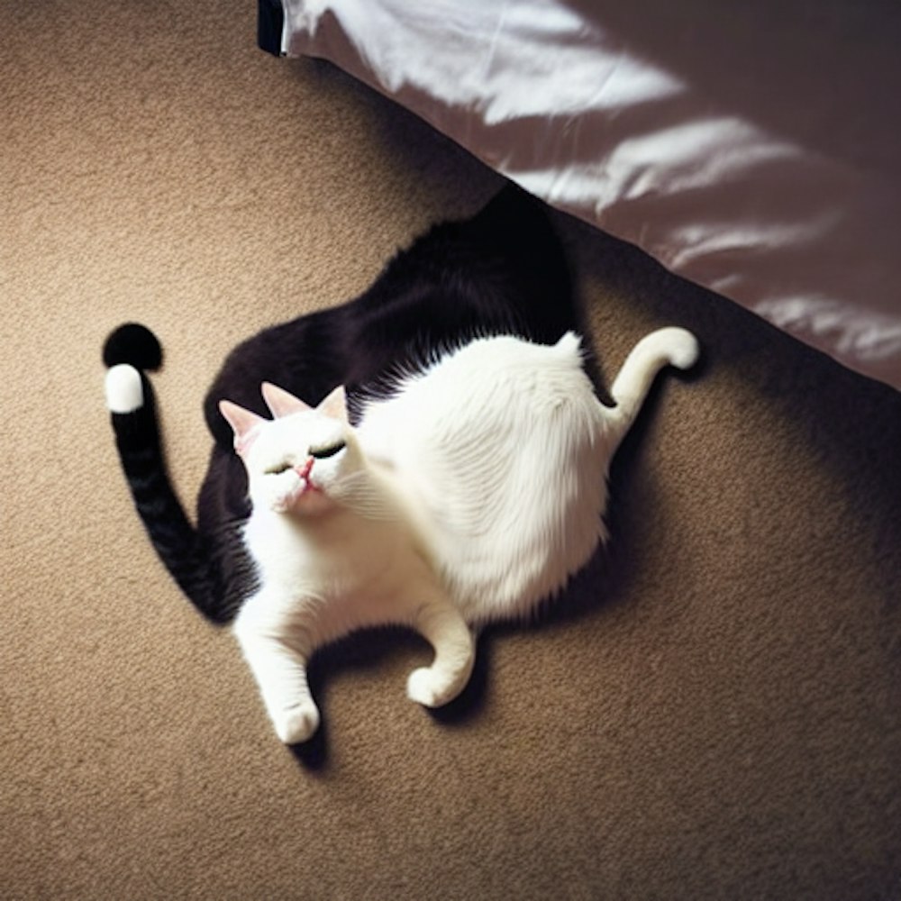 a cat is sitting on the face of a man sleeping on a bed in ruined room, realistic photo, super clear, view from above, areal photo