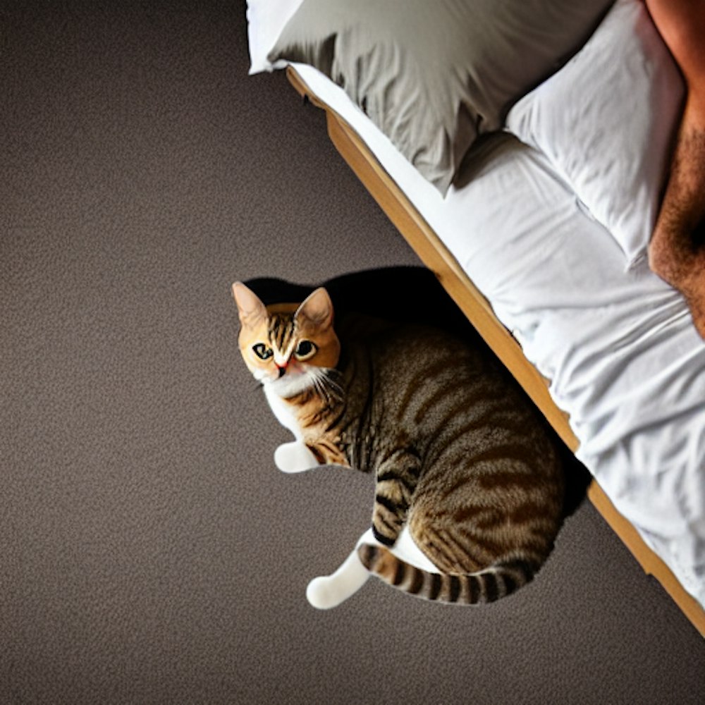 a cat is sitting on the face of a man, man is sleeping on a bed in ruined room, realistic photo, super clear, view from above, aerial photo