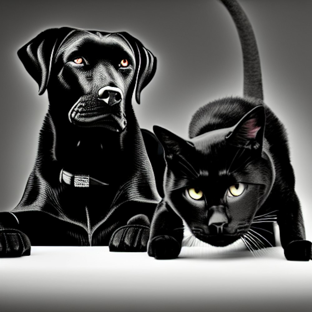 Black Labrador and black cat playing