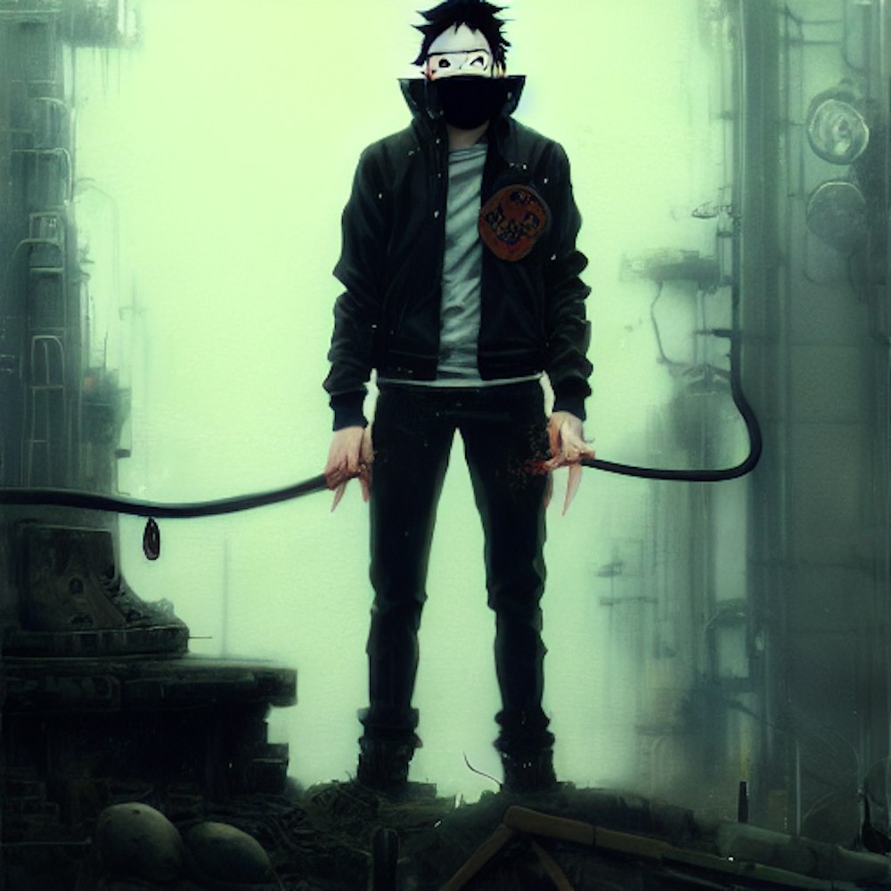 male, anime, wearing mask, black hair, retro, black jacket, wrench, watch dog, cinematic
