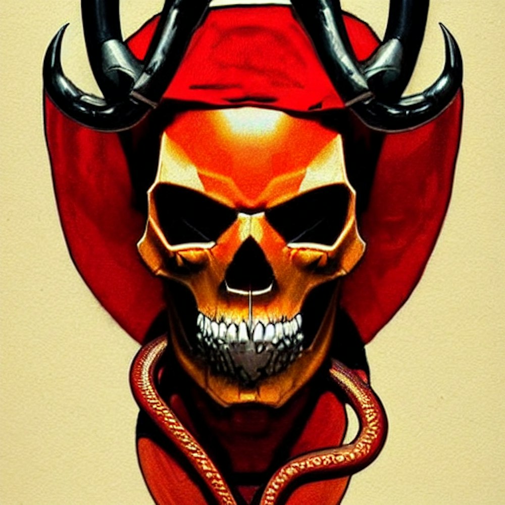Doom in a red cape, skull face, orange antlers, black staff with snake wrapped around, desert. intricate, Centered. Dittmann, Artgerm, WLOP, Mucha. Concept art. Planets, Space. Dynamic lighting. Regal. Bagshaw, Chevrier, Ferri, Kaluta, Minguez, Johansson