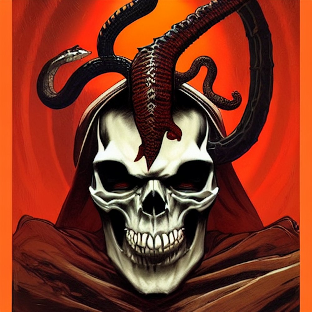 Doom in a red cape, skull face, orange antlers, black staff with snake wrapped around, desert. intricate, Centered. Dittmann, Artgerm, WLOP, Mucha. Concept art. Planets, Space. Dynamic lighting. Regal. Bagshaw, Chevrier, Ferri, Kaluta, Minguez, Johansson