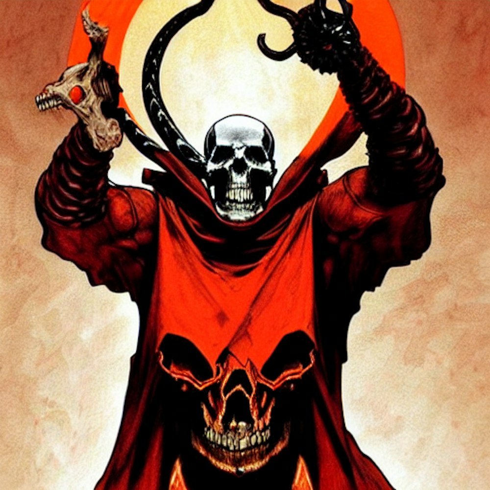 Doom in a red cape, skull face, orange antlers, black staff with snake wrapped around, desert. intricate, Centered. Dittmann, Artgerm, WLOP, Mucha. Concept art. Planets, Space. Dynamic lighting. Regal. Bagshaw, Chevrier, Ferri, Kaluta, Minguez, Johansson