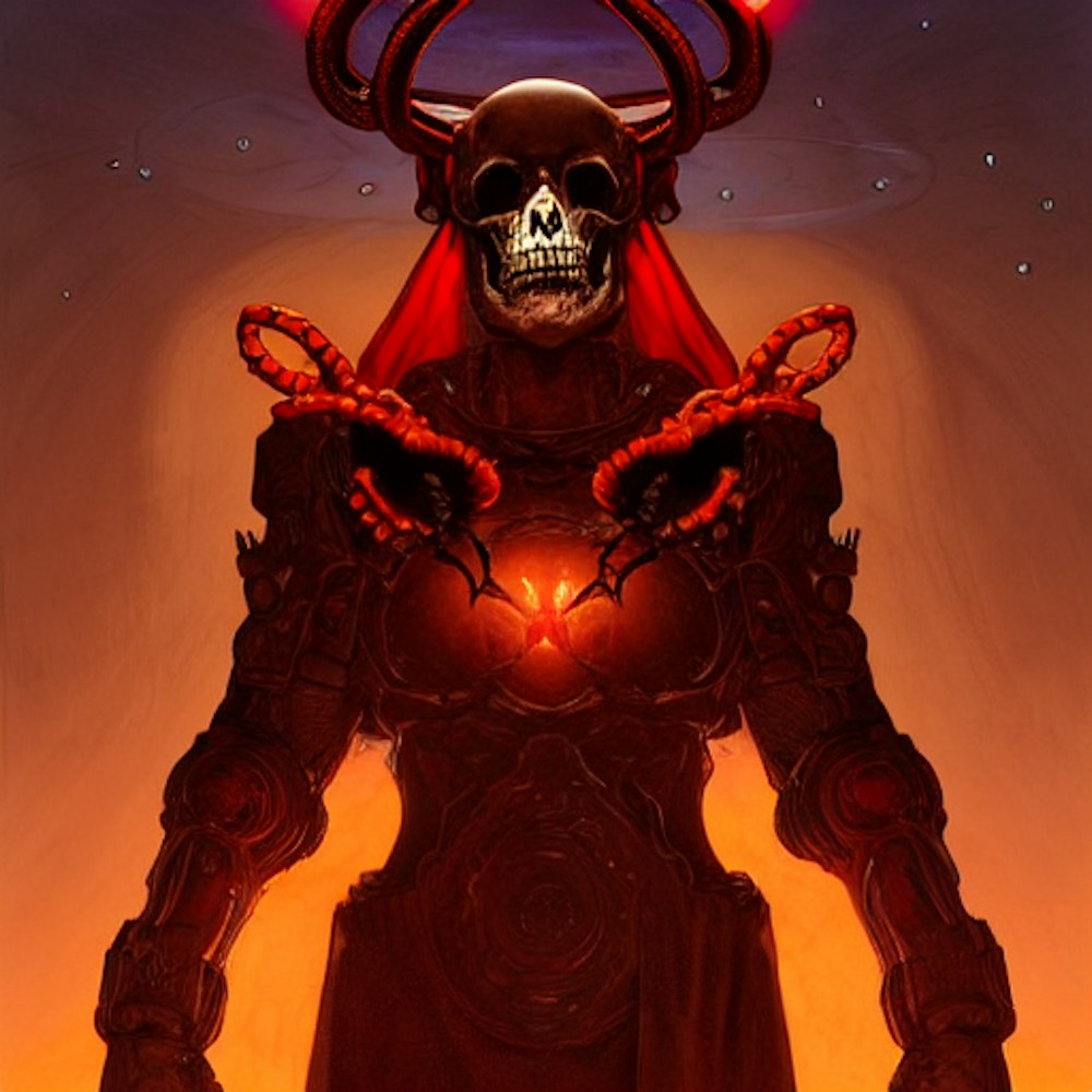 Doom in a red cape, skull face, orange antlers, black staff with snake wrapped around, desert. intricate, Centered. Dittmann, Artgerm, WLOP, Mucha. Concept art. Planets, Space. Dynamic lighting. James Gurney