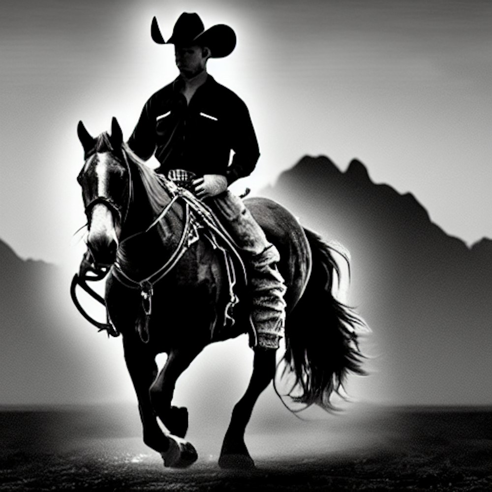 Cowboy on a horse in black and white