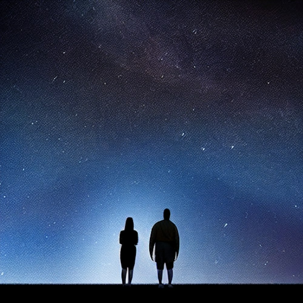two people, on the other side of the world, looking up at the stars, moon, night sky