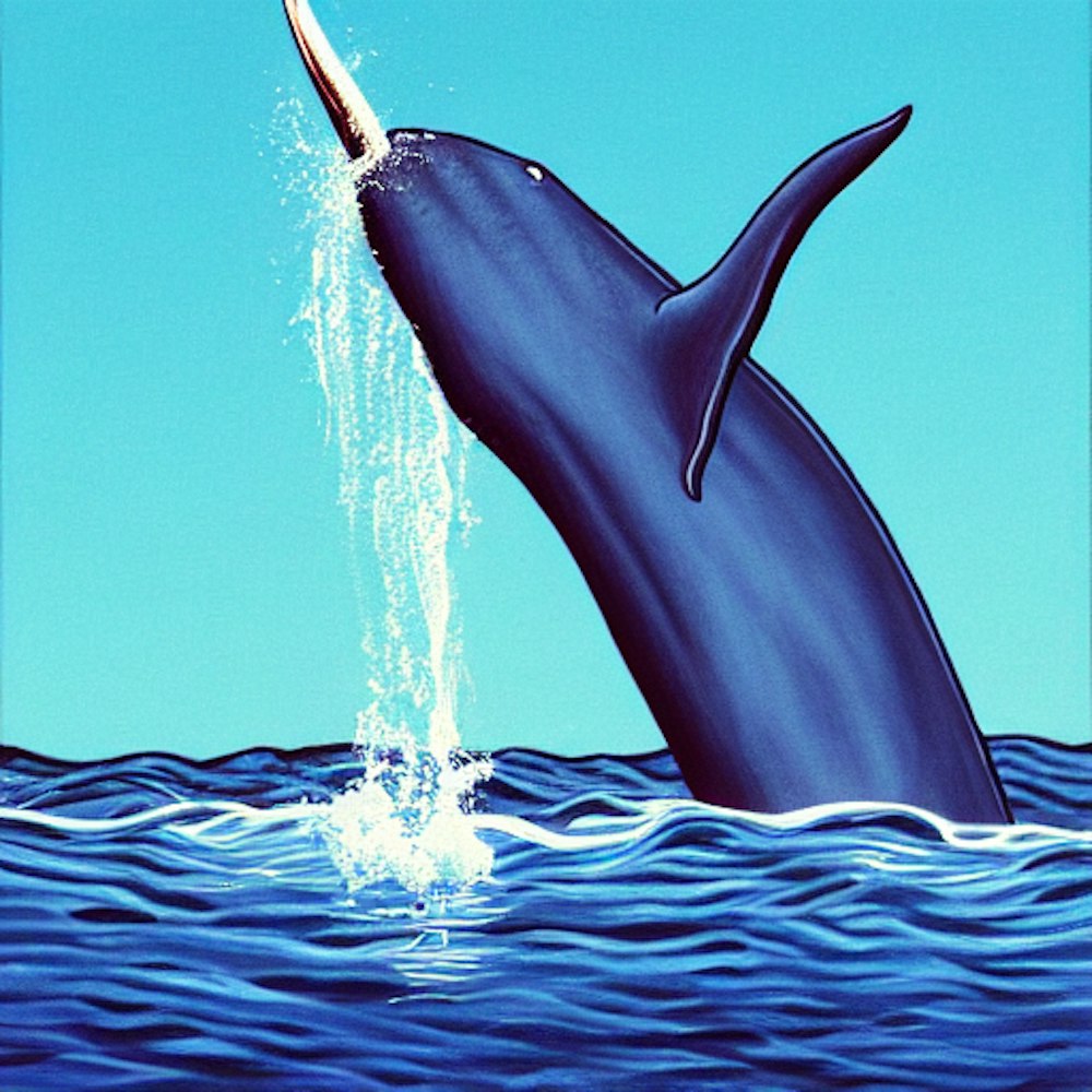 a paint of a narwhal whale coming out of the water, showing the tusk of it's nose.