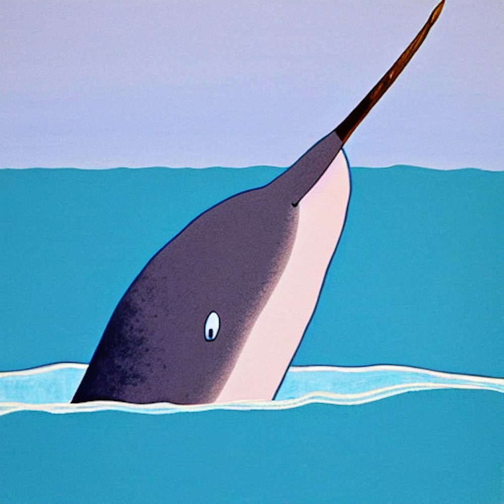 a paint of a narwhal whale coming out of the water, showing the tusk of it's nose.