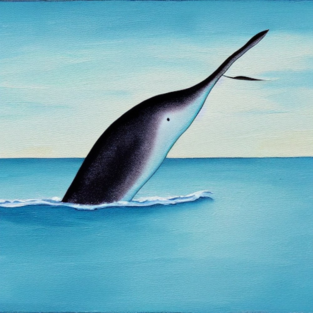 a paint of a narwhal whale coming out of the water, showing the tusk of it's nose.