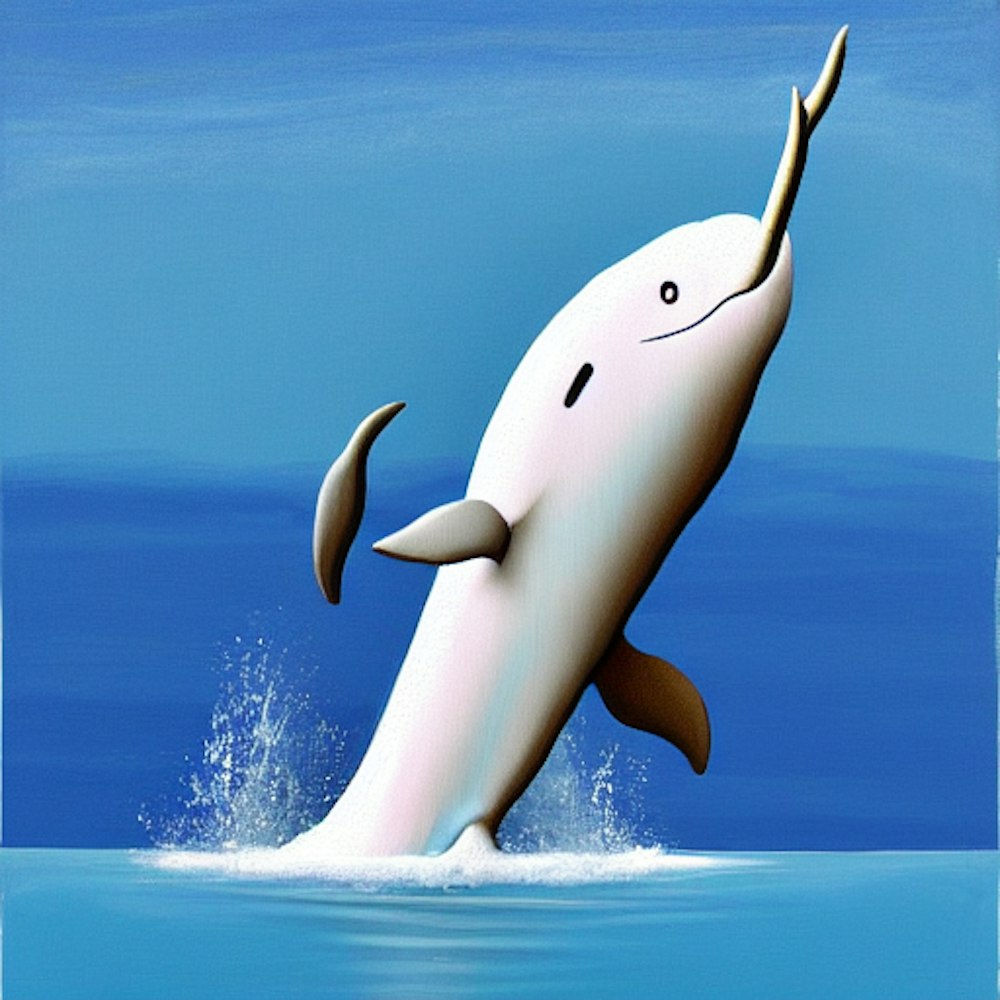 a paint of a narwhal whale coming out of the water, showing the tusk of it's nose.