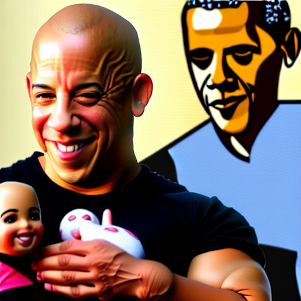 Vin Diesel playing with a Barack Obama doll, hyper-detailed