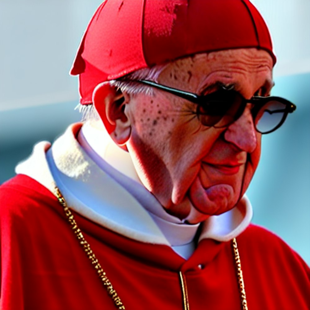The Pope wearing a red hoodie and sunglasses and wearing a large gold chain with a dollar sign on it