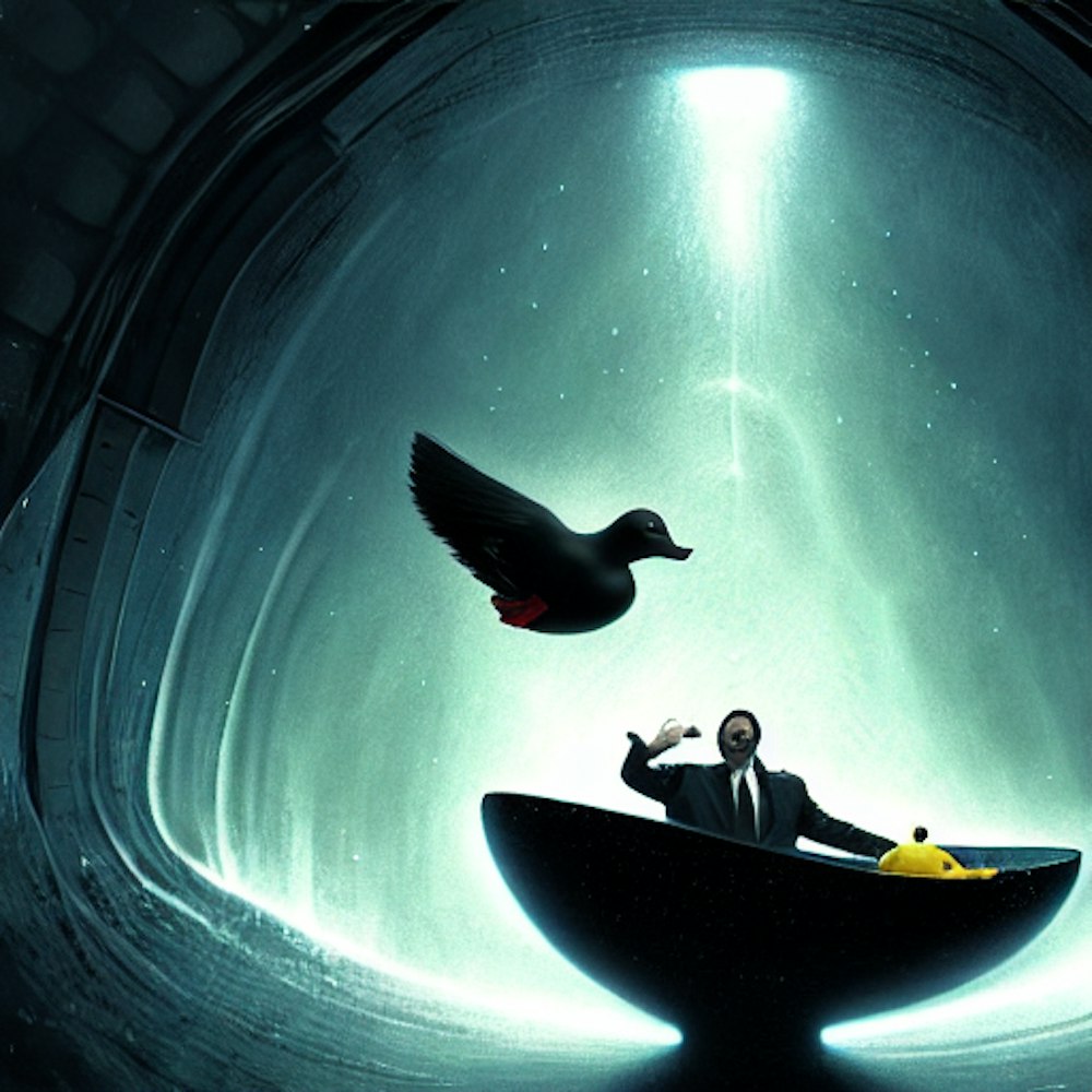 ultra realistic 4k Super massive black hole swallowing a rubber duck in a suit and tie