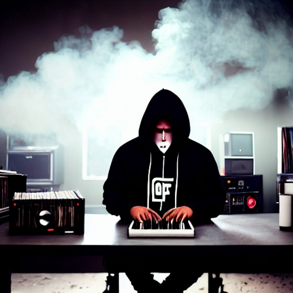 lofi, black electronic keyboard on a desk with smoke coming out of it, dusty basement hip hop music studio, stacks of records on the floor, hoodie, can't make out face because of smoke, smokey background, made of mist, atmospheric, Hyper Detail, 8K, HD, Octane Rendering, Unreal Engine, V-Ray, full hd, minimal
