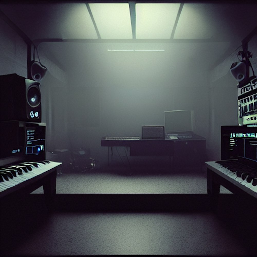 lofi, ASR10 keyboard keys, dusty basement hip hop music studio, smokey background, made of mist, atmospheric, Hyper Detail, 8K, HD, Octane Rendering, Unreal Engine, V-Ray, full hd, minimal