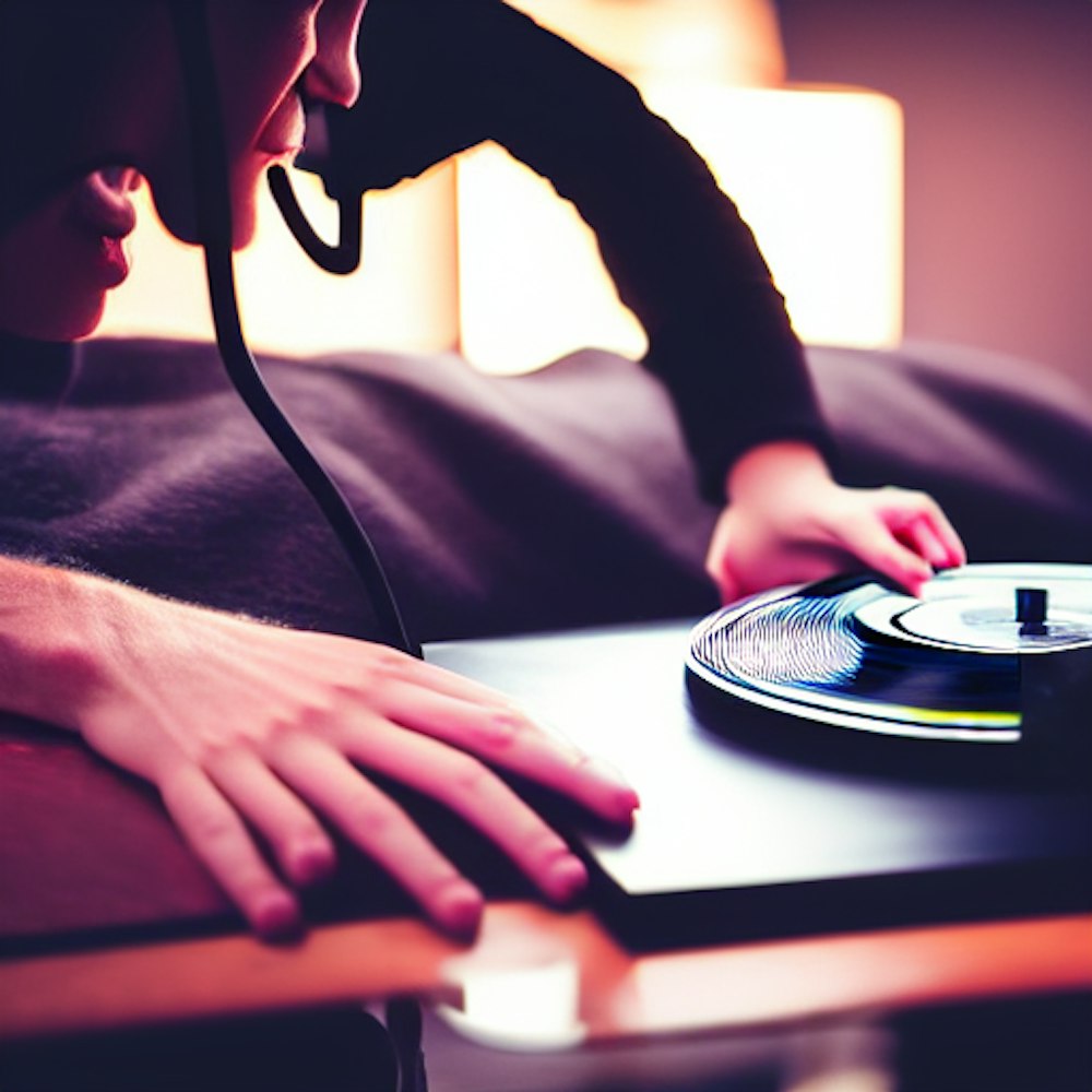 An image of a person with a vinyl record for a face sitting in front of a computer with a pair of headphones on and a hoodie on, surrounded by a warm and cozy atmosphere, with a black sampling keyboard in the background, Hyper Detail, 8K, HD, Octane Rendering, Unreal Engine, photo-realistic