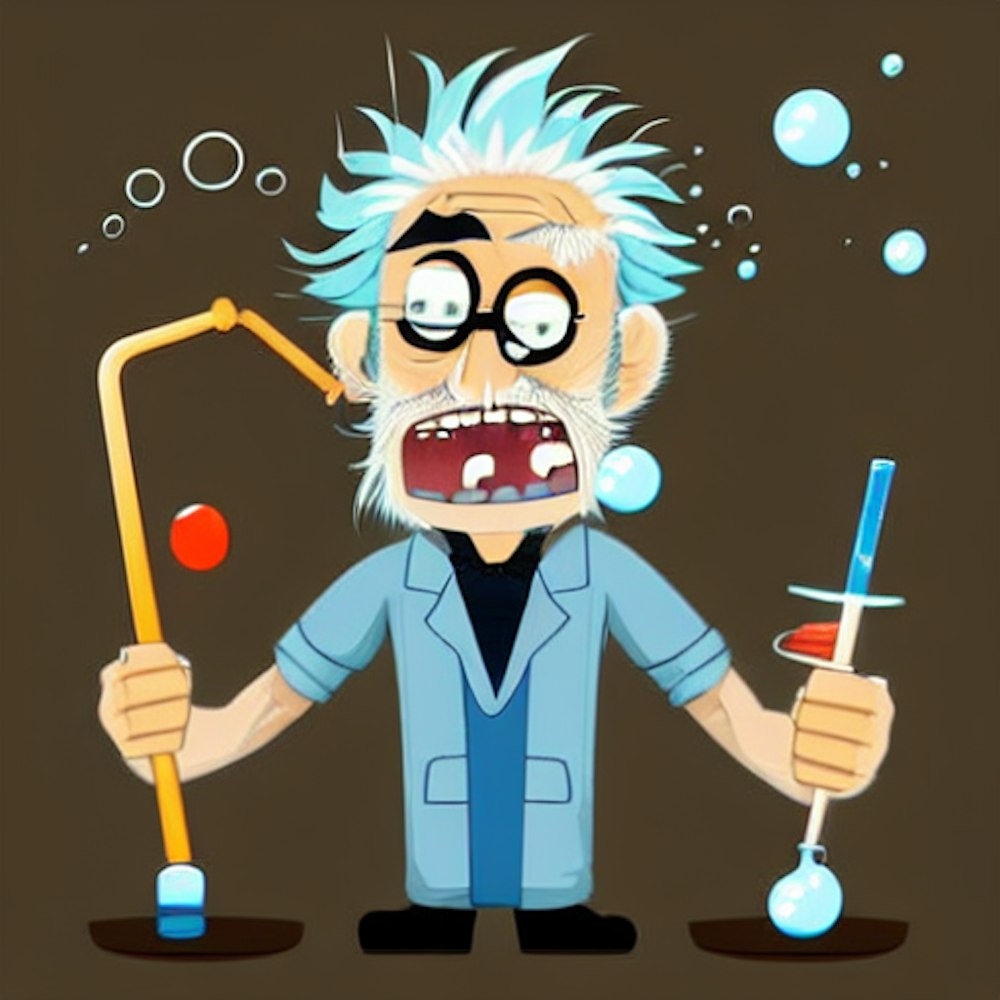 Design a detailed cartoon avatar of a mad scientist with a wild and unkempt appearance, with tufts of hair sticking out in various directions, and wearing a tattered lab coat over a button-up shirt and suspenders. The scientist should be depicted holding a test tube filled with a glowing, bubbling liquid, with a crazed expression on his face, and his eyes widened in excitement. The avatar should be in full color and have a bold, striking appearance that captures the essence of a mad scientist who is lost in his experimentation and discovery.