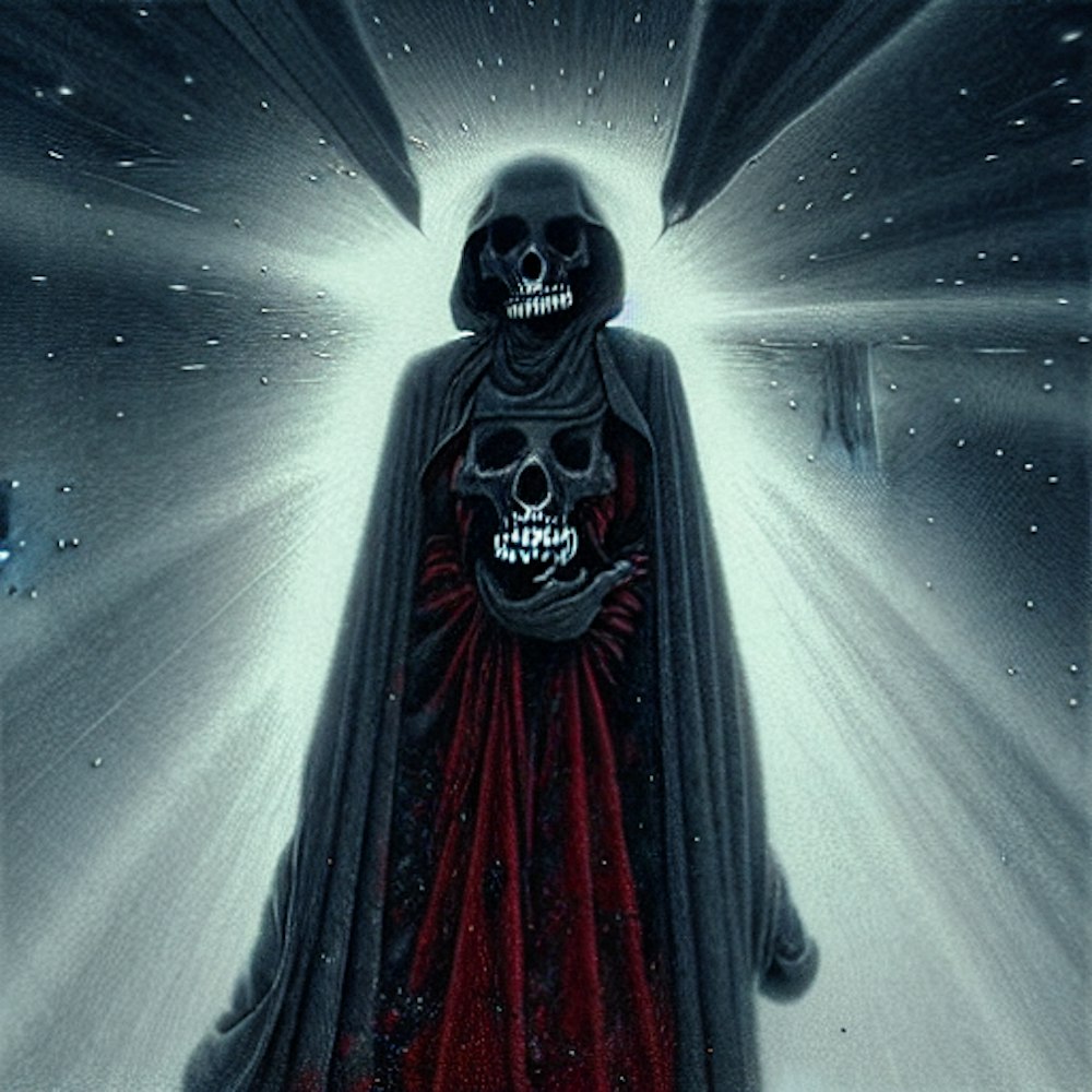 Doom skull face, red cape, Gods of creation, heaven, surreal, space, light rays, galaxy, space, stars, comet, horror Gustave Doré Greg Rutkowski,
