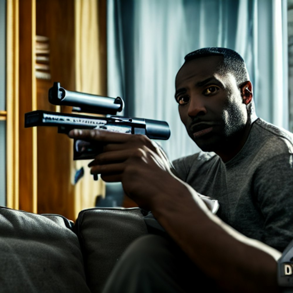 Black man on a white couch with gun trying to rob a shop man with tank defending 4k