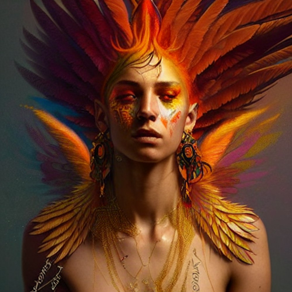 Phoenix Druid. Rainbow Feathered Tribal Cloth. Gold Tattoos. Beautiful Fiery Hair. Hyper Detailed. Hyper Elegant. Masterpiece. Fantasy.