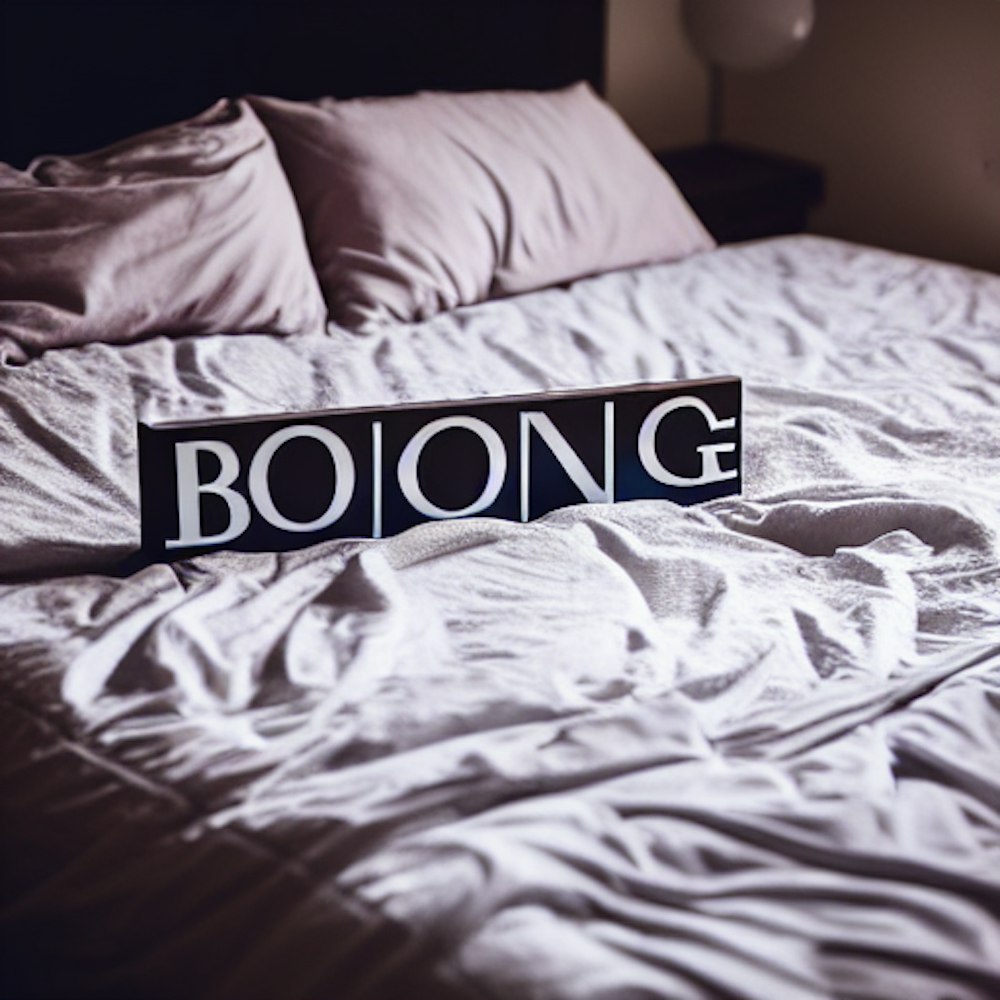 The word “Bounce” on a messy bed
