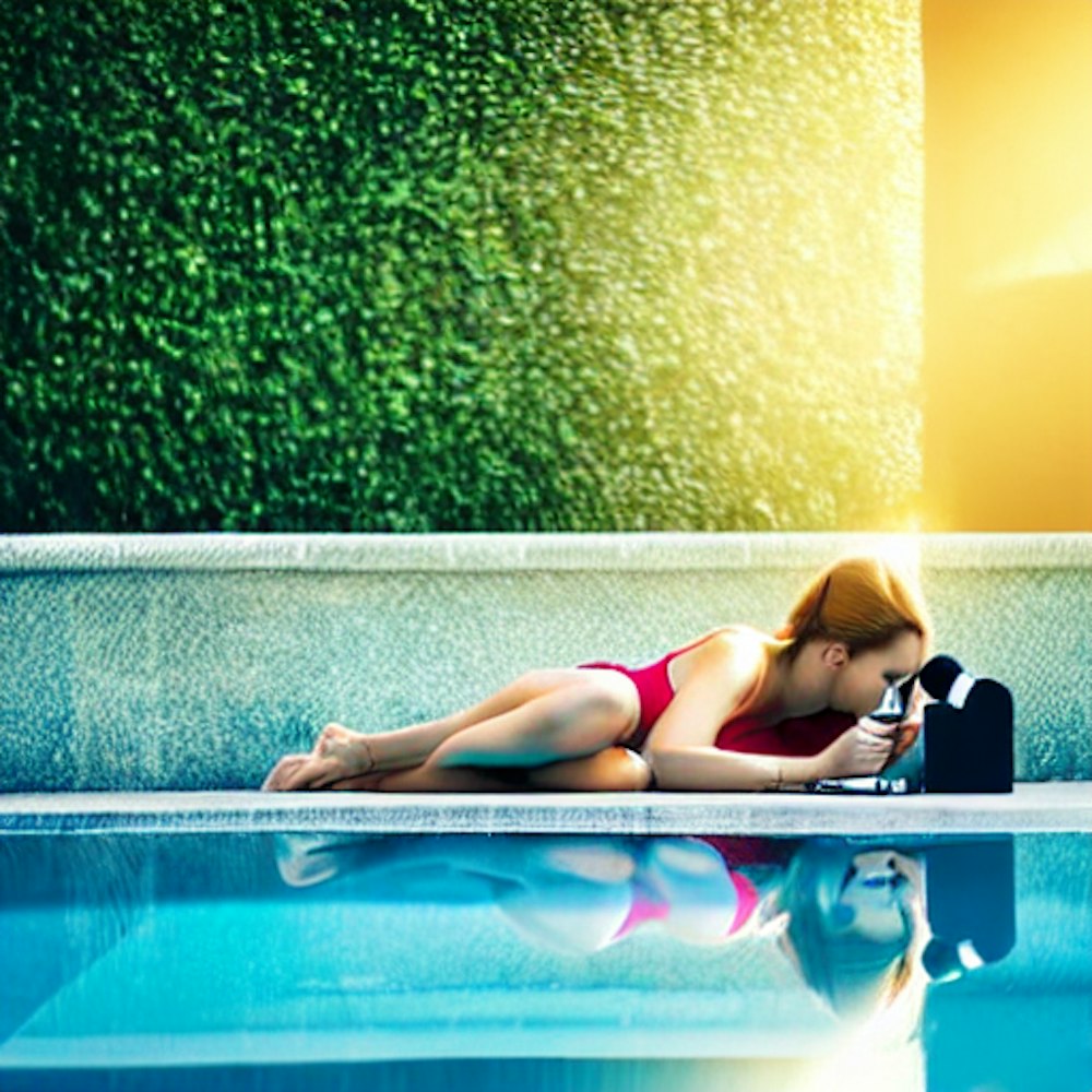 Outside patio girl sleeping by the pool with handphones on high detail sunny brick floor