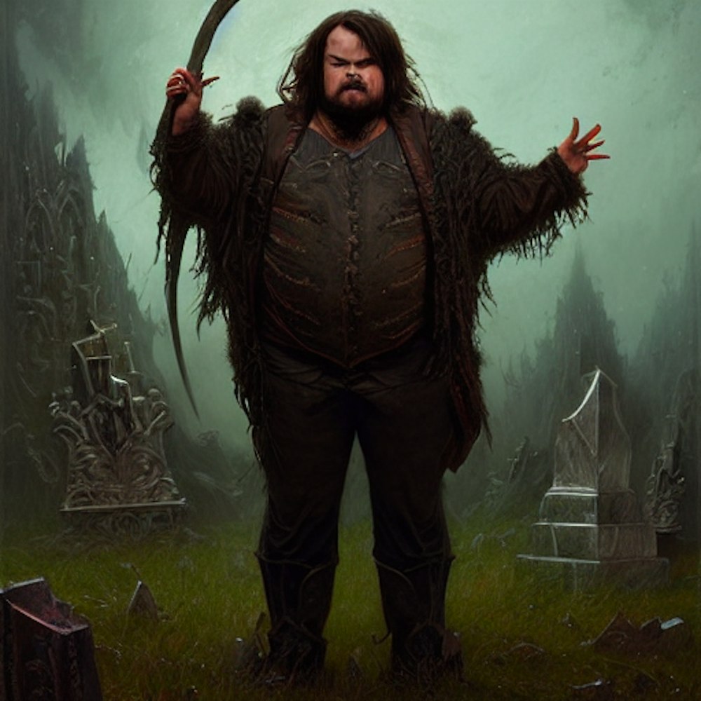 a portrait of actor Jack Black, fantasy character portrait, Graveyard landscape, ultra realistic, cinematic, concept art, wide angle, intricate details, hologram, highly detailed by greg rutkowski, aaron horkey, gaston bussiere
