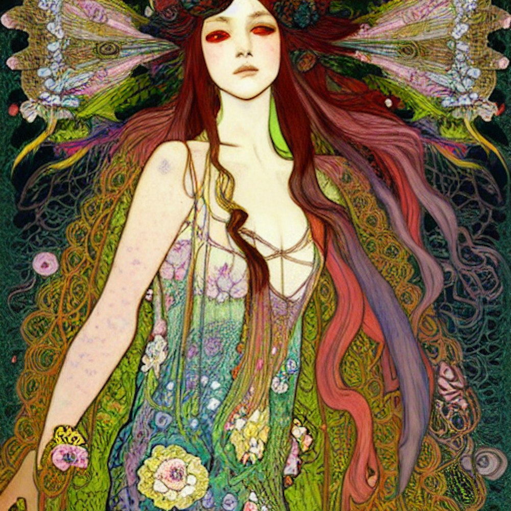 beautiful woman with long hair in motion in surreal Delicate Colorful Floral Embroidered and crochet Lace dress in warped perspective with forest exposure, Patchwork by Benjamin Lacombe and Gustave Moreau and Paul Gauguin and Alphonse Mucha