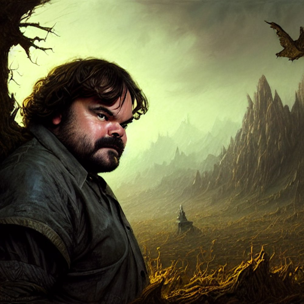 a portrait of actor Jack Black, fantasy character portrait, Graveyard landscape, ultra realistic, cinematic, concept art, wide angle, intricate details, hologram, highly detailed by greg rutkowski, aaron horkey, gaston bussiere