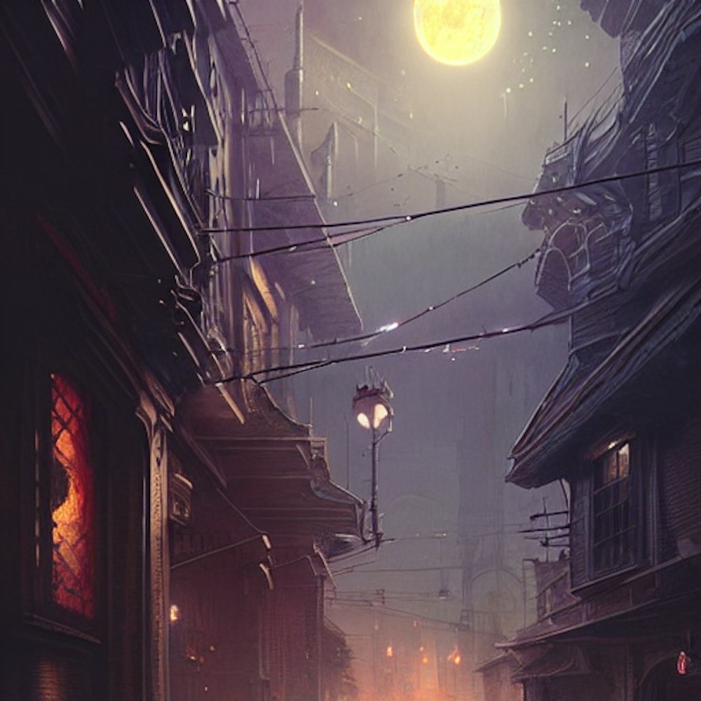 Wait outside while you're waking, cinematic lighting, hyper detailed, intricate design, concept art, ultra realistic, intriguing, finely detailed, masterpiece, Beeple, fantasy, landscape, city streets, large moon in background, Greg Rutkowski
