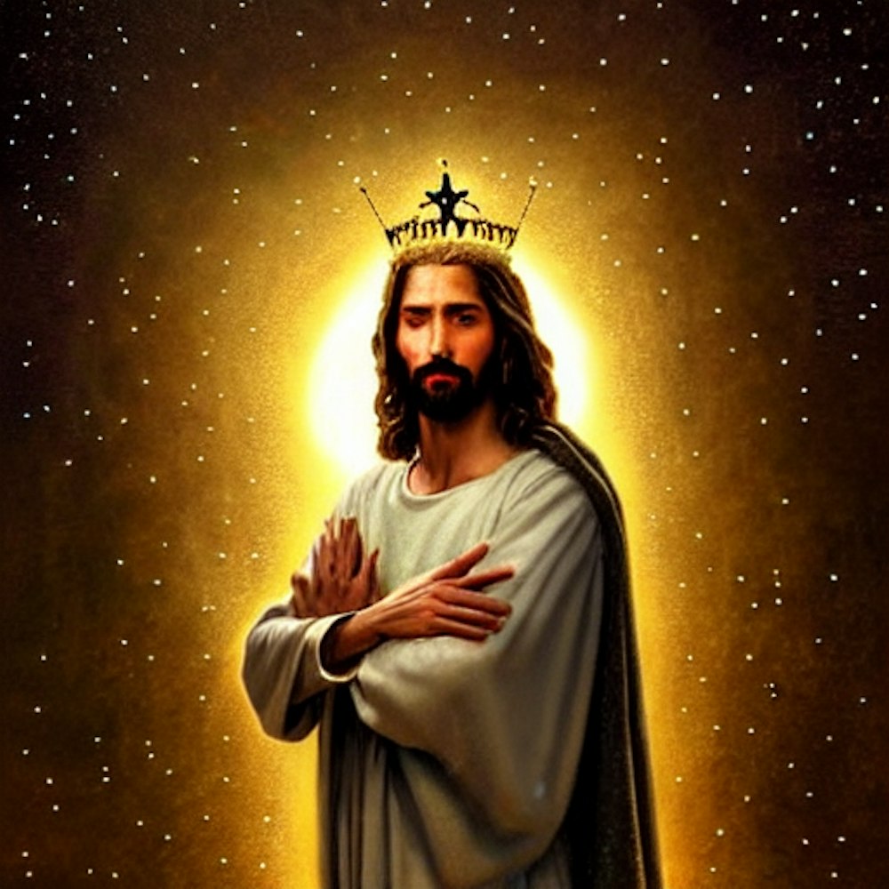 a portrait of Jesus Christ crying, wearing a crown of gold and diamonds fantasy character portrait, Heaven landscape, ultra-realistic, cinematic, concept art, wide angle, intricate details, hologram, highly detailed by greg rutkowski, aaron horkey, gaston