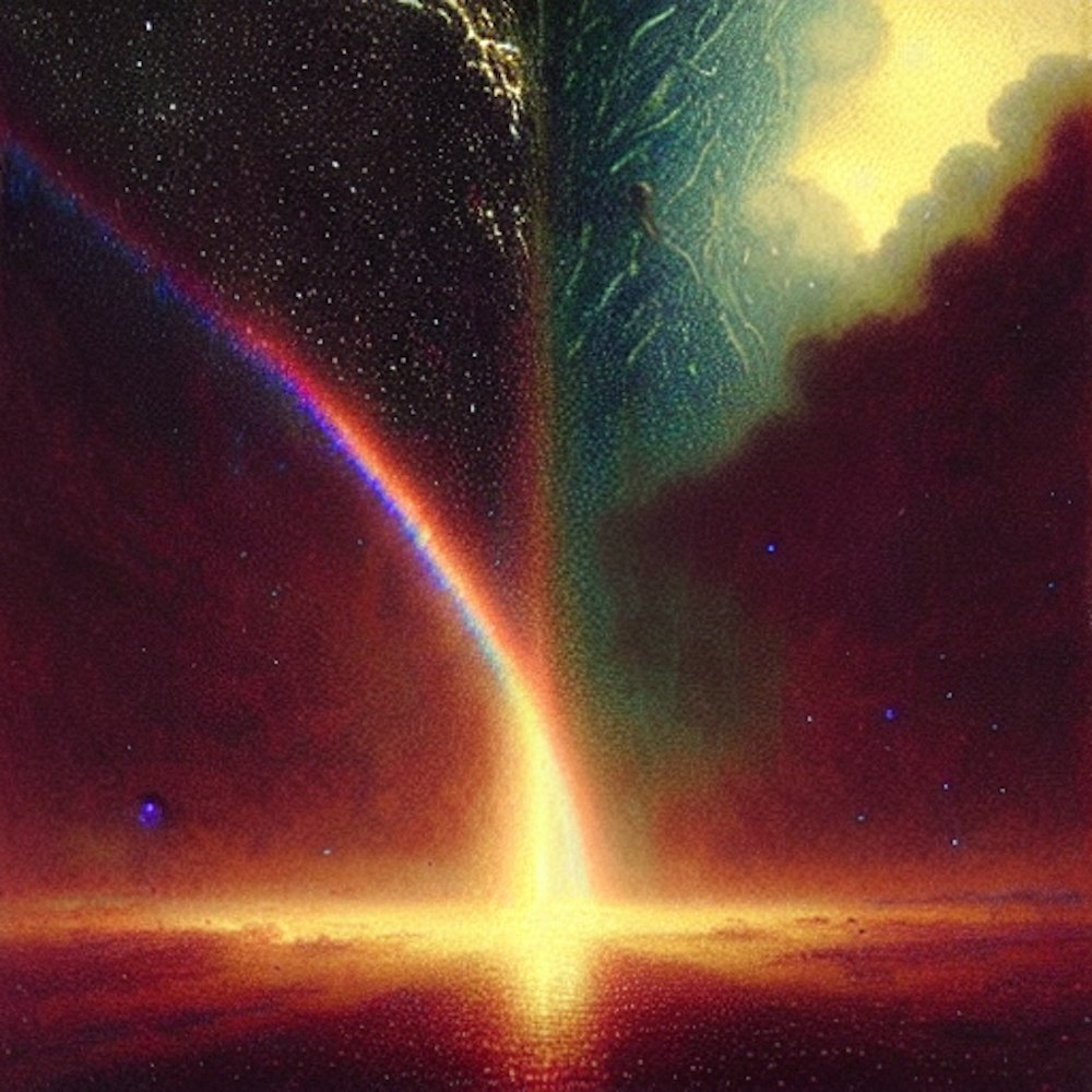 film grain, Flock of birds, surreal, space, light rays, galaxy, hell, black rainbow, space, stars, rainbow, comet, horror Gustave Doré Greg Rutkowski, James Gurney