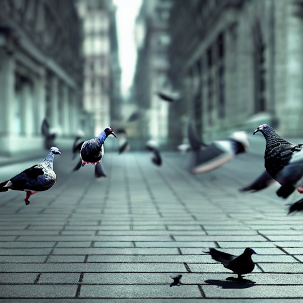 realistic image of man walking and pigeons flying out the way