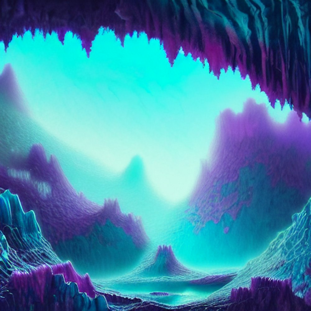 cave full of teal and purple crystals