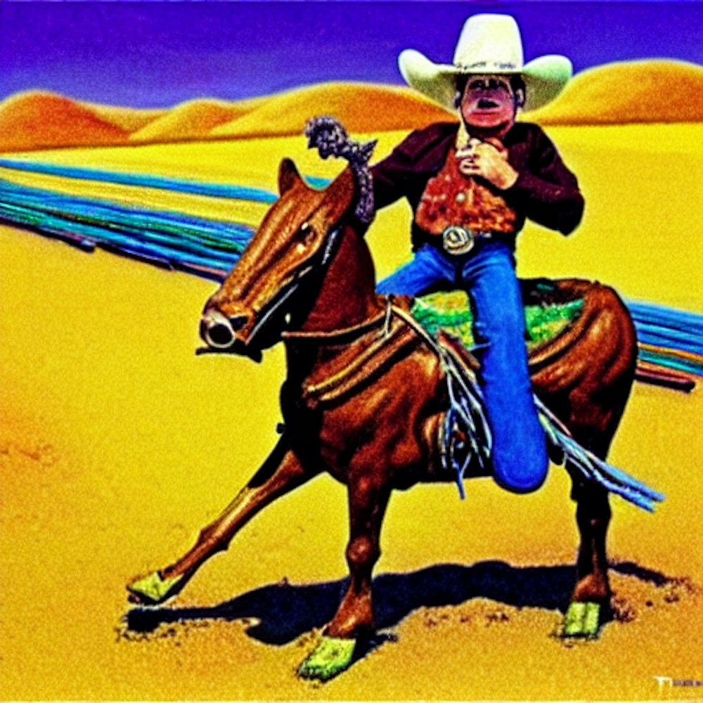 rotten cowboy riding the plains on a spongebob magic card wayne thiebaud