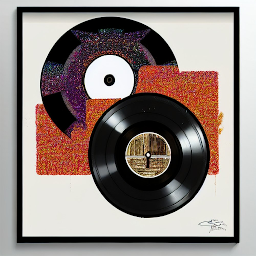 Record player, graffiti saying Vivid One, speakers blasting music, Harbour Bridge, opera house, Australian flag